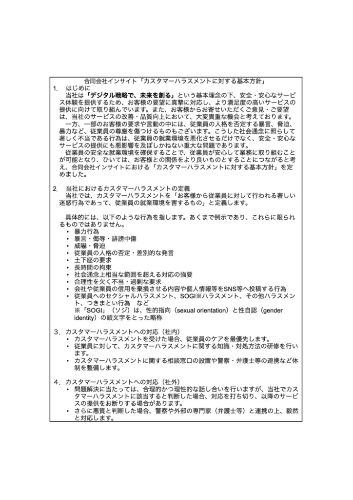 合同会社インサイトでは「カスタマーハラスメントに対する基本方針」に基づき、従業員の安全と安心を守り、すべてのお客様により良いサービスをご提供できるよう努めております。